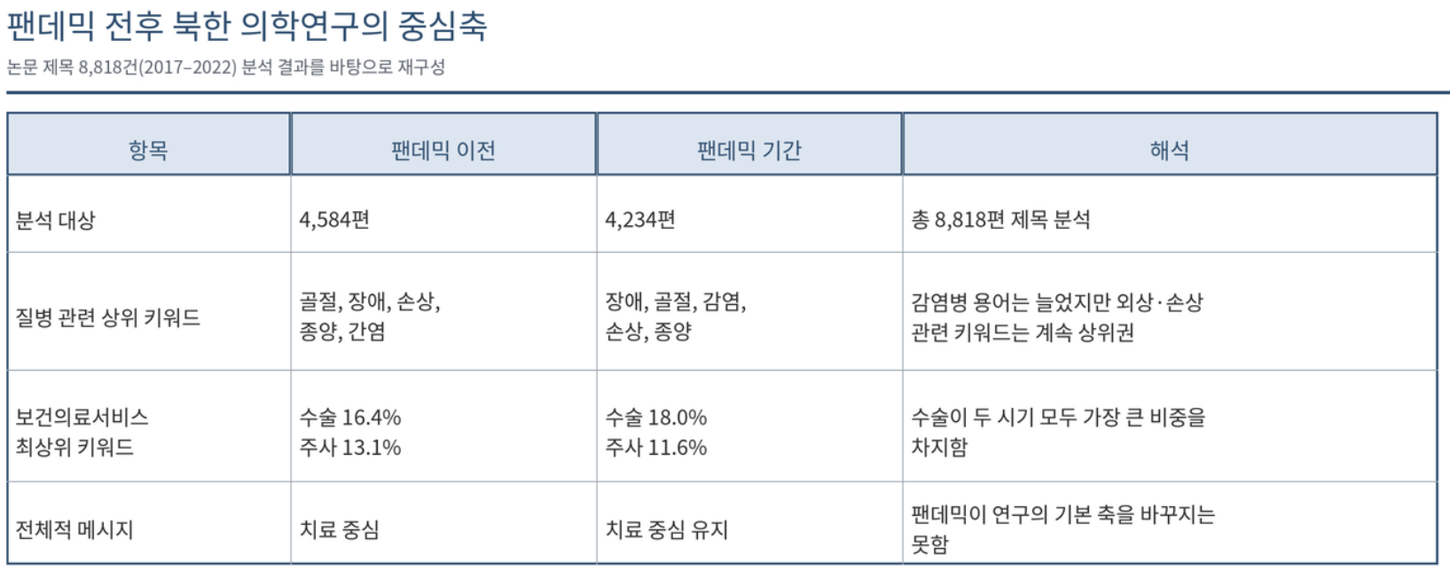 이 점은 북한 의학학술이 외부 충격에 따라 유연하게 재편되는 체계라기보다, 오랜 기간 형성된 문제 해결 방식과 제도적 우선순위에 강하게 묶여 있음을 보여준다. 감염 관련 언어는 증가했지만 연구의 큰 관심은 여전히 수술과 약물치료, 그리고 즉각적 임상 문제 해결에 보다 가까웠다. 다시 말해 팬데믹은 북한 의학연구에 새로운 어휘를 더했지만, 이렇다할 변화를 만들지는 못했다.