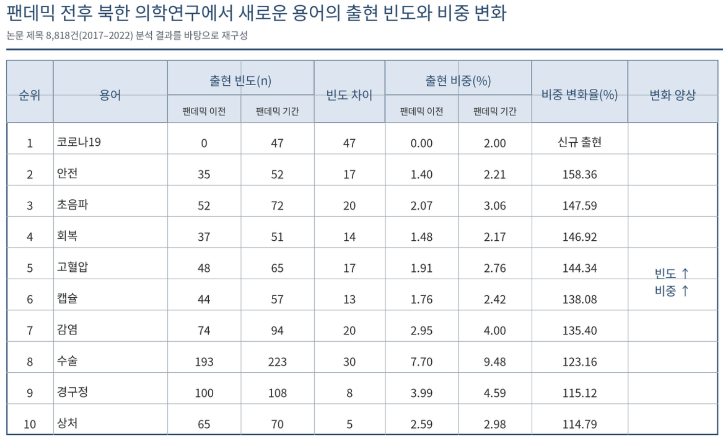 IHSAK 연구진은 2017년부터 2022년까지 북한의 주요 의학학술지 6종에 실린 논문 제목 8,818건을 수집해 텍스트 마이닝 분석을 수행했다. 시기는 팬데믹 이전(2017-2019)과 팬데믹 기간(2020-2022)으로 나누어 비교하였다. 분석 대상에는 기초의학, 내과, 외과, 예방의학, 조선의학, 조선약학이 포함되었고, 전체 제목 수는 팬데믹 이전 4,584건, 팬데믹 기간 4,234건이었다. 분석은 제목에서 핵심 명사를 추출한 뒤 질병 관련 용어와 보건의료서비스 관련 용어를 나누어 빈도를 비교했고, 단어들이 함께 나타나는 패턴을 바탕으로 잠재적 주제를 파악하기 위해 LDA 토픽모델링도 적용했다. 즉, 이번 분석은 북한 의학학술이 어떤 말을 더 자주 썼는지를 보는 동시에, 어떤 문제군이 연구의 묶음으로 유지되었는지를 함께 살펴본 작업이었다.
